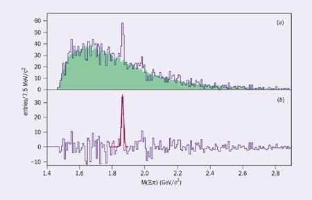 В эксперименте NA49, который проводится в CERN-е на ускорителе SPS (Super Proton Synchrotron), велись поиски состояния и в протон-протонных столкновениях при энергии 158 ГэВ [15]. Треки частиц, родившихся в протонных столкновениях, регистрировались в четырех больших камерах, наполненных газом. Высокое разрешение достигалось при помощи точной реконструкции траекторий и импульсов частиц, в то время как идентификация частиц проводилась по их ионизационным потерям в газе. Реконструкция вершин вторичных распадов дала возможность наблюдать сложные цепочки распадов пентакварковых состояний. После подавления фона при помощи подходящих экспериментальных ограничений в распределении по инвариантной массе -системы был обнаружен узкий пик на уровне 5,6 стандартного отклонения. Этот пик соответствовал инвариантной массе 1,862 0,002 ГэВ/c2