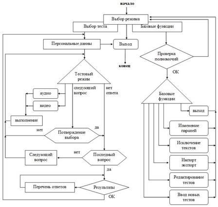 Предусмотрены три основные режимы работы: ввод персональных данных пользователей; тестовый режим и базовые функции. Для обучаемых доступны только первые два режима. Остальные пользователи – прежде всего преподаватели могут использовать некоторые из базовых функций после проверки их полномочий. Контроль работы с системой осуществляет Администратор защиты. Ему приходится также следить за правильным использованием всех режимов и прежде всего определять тип и число базовых функций системы.