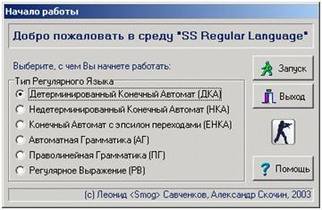 Целью написания программы "Regular Language", реализующей ИОС, является построение компьютерной модели для изучения важного класса формальных языков - регулярных множеств, образующих фундамент современной теории автоматов. Реализовано три метода описания таких языков: праволинейные грамматики, детерминированные и недетерминированные конечные автоматы, регулярные выражения. Праволинейные грамматики определяют порождающий механизм описания регулярных множеств, конечные автоматы представляют собой простейшие распознаватели. Регулярные выражения нельзя в полной мере отнести ни к порождающим, ни к распознающим моделям задания языка. Они представляют собой структурные записи для описания некоторых шаблонов построения допустимых цепочек, что позволяет использовать их в качестве метода описания входного языка во многих системах, обрабатывающих различные последовательности символов.