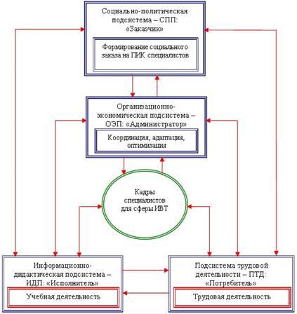 Подпроцессы, происходящие в социально-политической подсистеме (СПП), направлены на установление и юридическое закрепление факта необходимости подготовки кадров по определенным направлениям и специальностям, в частности, для сферы ИВТ и определение потребностей государства (по отраслям) в кадрах специалистов рассматриваемой сферы. Отметим, что в реальной российской жизни доминирующие факторы СПП приобретают особую роль и остроту в связи с усилением значимости национальных и межнациональных информационных ресурсов в экономике, политике, культуре, науке и естественно, образовании. Следствием указанной ситуации является возрастающие значение ИВТ в обеспечении заинтересованных потребителей в необходимой и достаточной мере информационными ресурсами.