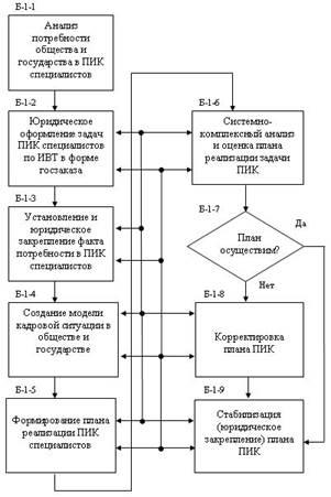 Б-1-3. Установление и закрепление на основе социальных и политических факторов юридического факта наличия потребности государства в целом, а также отраслей, регионов и т.п. в кадрах специалистов для сферы ИВТ. Иными словами, юридическая (законодательная) постановка задачи формирования социального заказа на подготовку и использование кадров специалистов для сферы ИВТ.