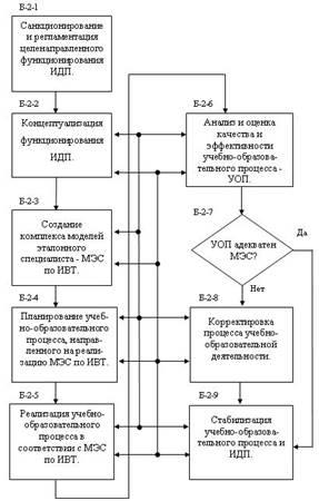Б-2-8. Восьмой этап ориентирован на выполнение функций корректировки – рационализации или оптимизации процессов учебно-образовательной деятельности (УОД) в рамках ИДП в случае ее неадекватности требованиям плана ПИК или, что тоже самое, МЭС. Реализация возникающих на предшествующих этапах проблем и задач должна осуществляться весьма осторожно, продуманно, постепенно (не в духе общеизвестной “перестройки”), посредством итеративных процедур, корректирующих учебный процесс и УОД в целом. Особую осторожность, на наш взгляд, следует проявить при корректировке МЭС, а также критериев оценки показателей качества и эффективности УОД.