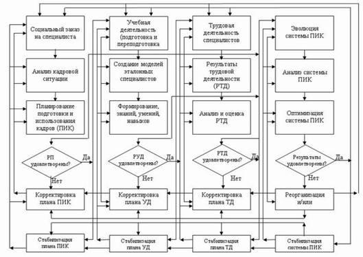 Процессы подготовки кадров специалистов, протекающие в ИДП, имеют достаточно сложную структуру, реализующую совокупность разноплановых функций. С целью целостного представления, анализа и описания ИДП в системе ПИК сформируем логическую макромодель ИДП и представим ее в форме органиграммы (рис. 3), т.е. совокупностью логически взаимосвязанных и взаимодействующих функциональных блоков, каждый из которых отражает определенный этап функционирования ИДП.