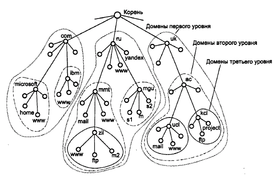 В стеке TCP/IP применяется доменная система символьных имен, которая имеет иерархическую древовидную структуру, допускающую использование в имени произвольного количества составных частей. Совокупность имен, у которых несколько старших составных частей совпадают, образуют домен имен. Доменные имена назначаются централизованно, если сеть является частью Интернета, в противном случае — локально.