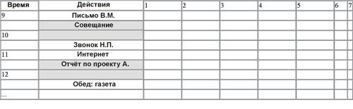 Для начала обеспечим себя этим фактическим материалом. Вооружитесь листочком бумаги, желательно в клетку. В левом столбике будет "портрет" вашего рабочего дня. При желании можно включить и нерабочее время. Для анализа лучше всего взять вчерашний день, но если он плохо отражает ваш обычный рабочий день, возьмите какой-нибудь другой, если вы его можете неплохо вспомнить. Можно вообще нарисовать портрет "типичного", "среднестатистического" рабочего дня, как вы его себе представляете, только обязательно "как это обычно бывает", а не "как мне хотелось бы, чтобы это обычно бывало".