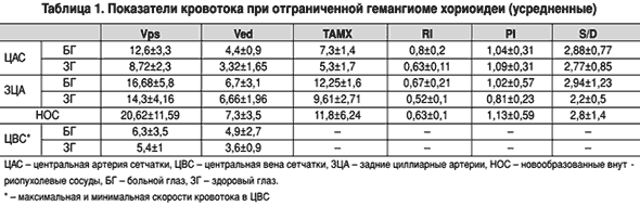 В режиме ЦДК с помощью цветовых картограмм потоков визуализировали собственные сосуды опухоли, изучали их ангиоархитектонику. С помощью спектрального допплеровского анализа регистрировали показатели кровотока в собственных сосудах образования, центральной артерии и вене сетчатки (ЦАС, ЦВС), задних циллиарных артериях (ЗЦА). Контролем являлись гемодинамические параметры в ЦАС, ЦВС и ЗЦА здоровой стороны.
