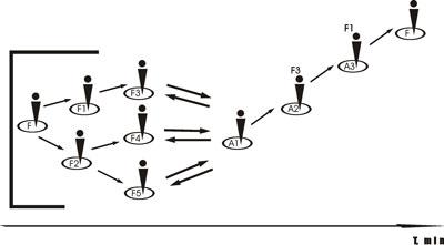 Далее, представить себе все возможные предшествующие варианты формы и содержания — декомпозировать систему во времени, разбить на вариантные составляющие, предшествующие состоянию F и друг другу.