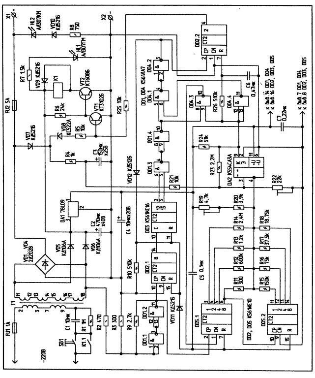 Схема зарядного устройства приведена на рис.3.1. Она содержит блок питания, выполненный по простой и хорошо зарекомендовавшей себя схеме с гасящим конденсатором. Микросхемный стабилизатор напряжения DA1 обеспечивает питанием цифровую часть устройства. На элементах DD1.1 и DD1.2 собран формирователь прямоугольных импульсов частотой 50 Гц. Счетчики DD2.1, DD3 совместно с элементами DD1.3, DD1.4 образуют таймер, определяющий периодичность контроля за ростом напряжения на заряжаемой аккумуляторной батарее. Двоичные счетчики DD5.1 и DD5.2 совместно с резистивной матрицей R11...R20 образуют управляемый генератор ступенчато возрастающего напряжения, используемого в качестве опорного для определения с помощью компаратора DA2 прекращения роста напряжения на аккумуляторной батарее. Двоичный счетчик DD2.2 вырабатывает сигнал на выключение устройства при постоянстве напряжения на батарее в течение заданного времени. На транзисторах VT1, VT2 собран узел управления реле К1.
