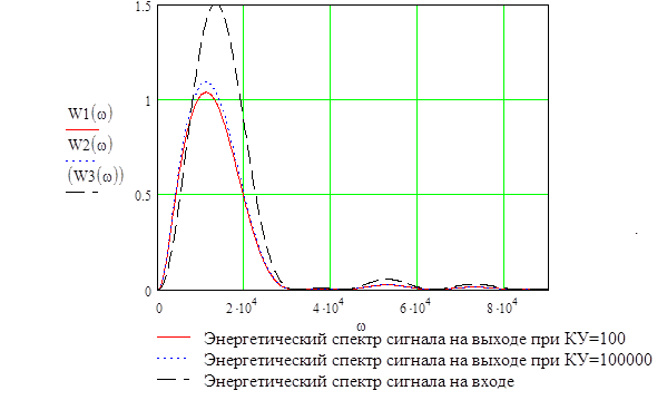 Были получены реакции цепи для двух значений коэффициента усиления операционного усилителя. По результатам анализа можно говорить о том, что изменение значения коэффициента усиления ОУ крайне мало влияет на частотные характеристики цепи и свойства выходного сигнала. Спектральные характеристики выходных сигналов для разных КУ также мало отличаются друг от друга, при увеличении w пратически повторяют характеристику импульсного сигнала на входе.