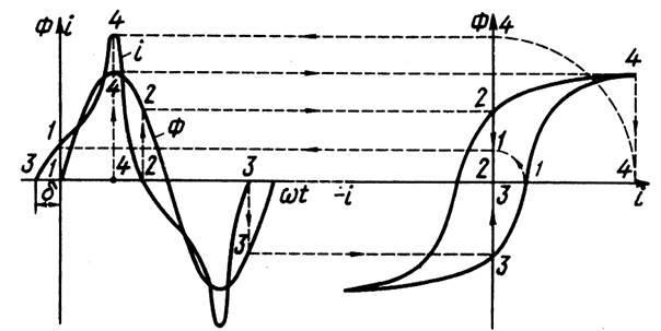Магнитный гистерезис вносит дополнительные изменения в форму кривой намагничивающего тока. Эти изменения обусловлены тем, что при увеличении магнитного потока ход кривой тока определяется восходящей, а при уменьшении потока – нисходящей ветвью петли гистерезиса.