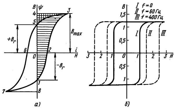 Для размагничивания сердечника от –B, до 0 и последующего намагничивания до Bmax затрачивается энергия, которая определяется площадью, ограниченной контуром 1-2-3-4-0-1. Эта площадь непосредственно определяет величину HdB, но dB пропорционально dy, а H пропорционально i.