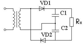 Выпрямитель состоит из двух диодов, которые работают поочередно; во время полупериодов питающего напряжения одного знака импульсами прямого тока через диод VD1 заряжается конденсатор С1 (Рис.1), а во время полупериодов обратного знака через диод VD2 заряжается конденсатор С2. Так как эти конденсаторы по отношению к нагрузке выпрямителя соединены между собой последовательно, на ней получается удвоенное напряжение.