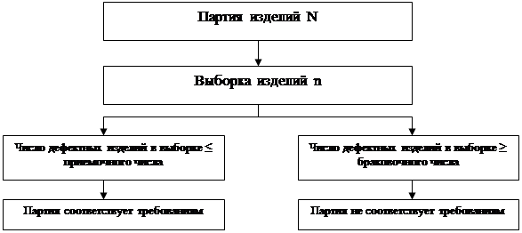, партия бракуется. Поскольку при одноступенчатом контроле решение принимают по результатам только одной выборки или пробы, то эта выборка должна хорошо отражать свойства всей партии и для этого быть случайной. Случайную выборку получают отбором из различных частей партии. Ход действия при применении одноступенчатых планов контроля показан на рисунке 2.