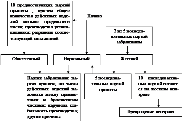 Если десять последовательных партий подвергаются жесткому контролю, приемка продукции должна быть остановлена. Приемка возобновляется после проведения мероприятий по улучшению качества представляемой продукции. На рисунке 4 показаны правила переходов между видами контроля.