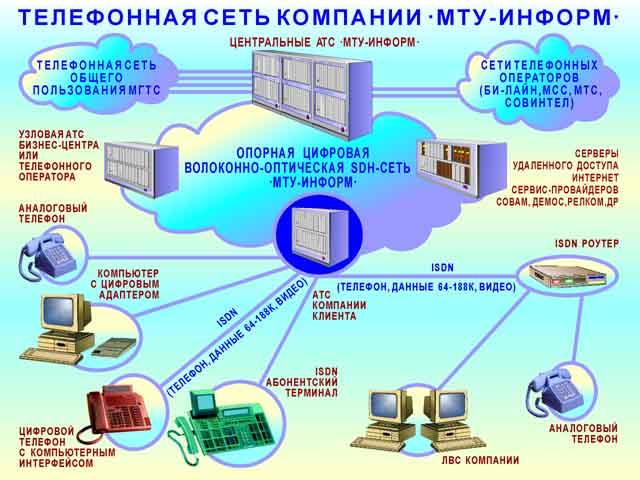 ГЛАВА 1 РЕШЕНИЕ ПРОБЛЕМЫ ПЕРЕДАЧИ ИНФОРМАЦИИ НА ПРИМЕРЕ КОМПАНИИ «МТУ-ИНФОРМ» Компания "МТУ-Информ" (сокращение от "Московские телекоммуникационные услуги и информатика") создана в 1992 году и является целиком российским предприятием. "МТУ-Информ" действует преимущественно на территории Москвы и Московской области – как самостоятельно, так и через дочерние компании. Основные сферы деятельности в настоящее время – предоставление услуг проводной телефонии и услуг по передаче цифровых данных. "МТУ-Информ" располагает собственной крупнейшей в Москве оптоволоконной транспортной сетью. По числу обслуживаемых абонентов телефонной связи компания занимает сейчас в столице второе место. В ближайшее время перечень услуг значительно расширится: планируется ввод в действие цифровой сети радиотелефонии, трансляция программ кабельного телевидения, появление "интеллектуального" коммуникационного сервиса, обеспечение полноценного выхода в Интернет и др. Среди клиентов – крупнейшие отечественные и зарубежные фирмы, банки, гостиницы, аэропорты, информационные агентства и т.д. "МТУ-Информ" – молодая и стремительно развивающаяся компания, постоянно совершенствующая свою техническую базу и непрерывно расширяющая набор предоставляемых услуг. С помощью их сервера всегда можно получать самую оперативную и полную информацию. ЭТИ СЕТИ ЕСТЬ СЕГОДНЯ: