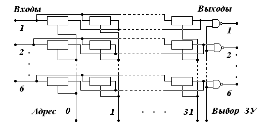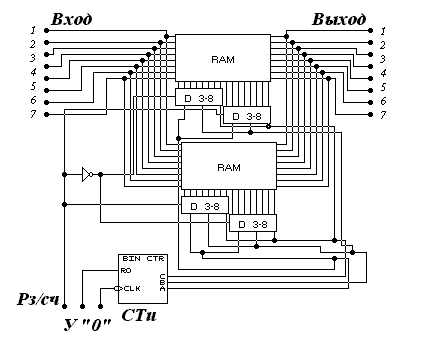 Организация ОЗУ словарная, но при записи информации каждая ячейка памяти состоит из элементов памяти, входящих в соответствующий столбец матрицы, а при считывании - из элементов, входящих в соответствующую строку. Схема данного устройства состоит из: