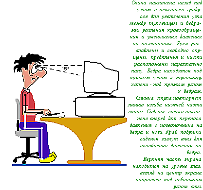 - Рис. 9.1 Зоны компьютерного излучения А - вид сверху; Б - вид сбоку. Цифрами обозначены зоны и даны величины напряженности электромагнитных полей в них. Как показали исследования конвергенции глаз в зависимости от частоты мельканий экрана дисплея, точка конвергенции смещается тем дальше, чем меньше частота мельканий. Частота сердцебиений и ее нестабильность являются надежными индикаторами умственной нагрузки. Наиболее оптимальное расстояние наблюдения - 50 - 80 см. Крупный шрифт читается лучше при одинаковых угловых размерах. Мелькание и дрожание экрана и изображения, резкое падение контраста при внешней засветке отмечаются при работе на дисплеях с вакуумными трубками. Альтернативными технологиями являются плоские плазменные, электролюминесцентные и новейшие жидкокристаллические (ЖК) экраны. Плазменная технология практически исключает мелькание. Электролюминесцентные дисплеи требуют высоких напряжений, что существенно удорожает схемы управления. Наибольшей экономичностью обладают ЖК-дисплеи, как для переносных, так и для стационарных компьютеров. Внедрение дисплеев в разных странах сопровождается реализацией широких программ. 9.3 ЭЛЕКТРОМАГНИТНЫЕ ПОЛЯ И ИЗЛУЧЕНИЯ. Дисплеи с электроннолучевыми трубками (ЭЛТ) являются потенциальными источниками мягкого рентгеновского, ультрафиолетового, инфракрасного, видимого, радиочастотного, сверх- и низкочастотного электромагнитного излучения (ЭМИ). С конца 70-х годов предметом дискуссий и исследований стал вопрос о возможном влиянии комплекса ЭМИ или отдельных его видов на возникновение кожной сыпи, катаракт глаза, самопроизвольных абортов. Источниками ЭМИ радиочастотного и низкочастотного диапазонов могут являться система горизонтального отклонения луча электронно-лучевой трубки (ЭЛТ) дисплея, работающего на частотах 15 - 53 кГц, блок модуляции луча ЭЛТ – 5 - 10 МГц, система вертикального отклонения и модуляции луча ЭЛТ – 50 - 81 Гц. Электромагнитное поле (ЭМП) имеет электрическую и магнитную составляющие, причем взаимосвязь их достаточно сложна. На расстоянии от видеотерминалов до оператора электрическая и магнитная составляющие поля оцениваются раздельно. Большинство опубликованных результатов измерений касается излучения, исходящего от видеотерминалов, тогда как стандарты разрабатываются применительно к воздействию излучения на организм человека. Широкий спектр частот электромагнитных сигналов создает существенные сложности для измерений и комплексной оценки. В настоящее время еще нет обоснованных рекомендаций по метрологии ЭМИ дисплеев, а опубликованные сведения об уровнях ЭМП противоречивы. Результаты гигиенических и клинико-физиологических исследований, осуществленных специалистами Российского НИИ профессиональных заболеваний, послужили основанием для разработки проекта санитарных норм и правил для тех, кто работает с видеотерминалами. С учетом широкополосности спектра ЭМИ видеотерминала предложен самый широкий норматив - в диапазоне частот 0,06 - 300 МГц - 10,0 В/м по электрической составляющей и 0,3 А/м по магнитной составляющей. 9.4 ЗРЕНИЕ И КОМПЬЮТЕР. Современный служащий, работающий на компьютере, читает не отраженные тексты, как при обычной работе с бумагой и письменными принадлежностями, а смотрит на источник света - дисплей. Его глаза перебегают с бу