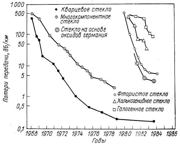 На рис. 2 показано снижение минимальных потерь передачи для различных оптических волокон на протяжении минувших десяти с лишним лет. Можно заметить, что для кварцевых оптических волокон потери за 10 лет (в 1970-е годы) уменьшились примерно на два порядка.