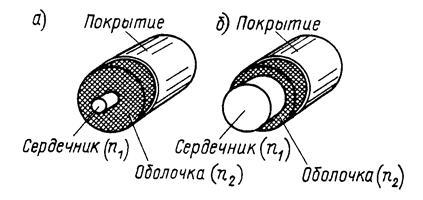 Рис. 3. Одномодовое (а) и многомодовое (б) оптическое волокно