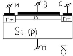 Рис. 2. Структура полевого транзистора с изолированным затвором: а - с индуцированным каналом ; б - со встроенным каналом.