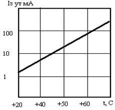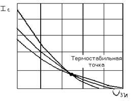 Рис. 5. Сток - затворные характеристики полевого транзистора при разных температурах.среды и указано положение термостабильной точки. Зависимость крутизны характеристики от температуры у полевых транзисторов такая же как и у тока стока. С ростом температуры ток утечки затвора увеличивается. Хотя абсолютное изменение тока незначительно , его надо учитывать при больших сопротивлениях в цепи затвора. В этом случае изменение тока утечки затвора может вызвать существенное изменение напряжения на затворе полевого транзистора и режима его работы. Температурная зависимость тока утечки затвора полевого транзистора с р-п