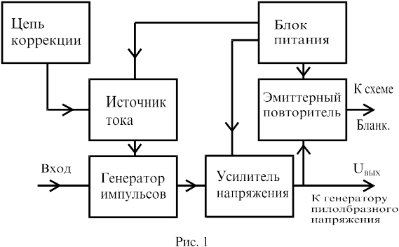 С выхода усилителя напряжения управляющий импульс поступает на вход схемы генератора пилообразного напряжения и через эмиттерный повторитель на схему формирования блокирующего импульса.