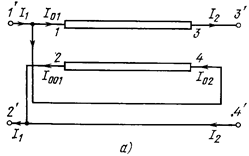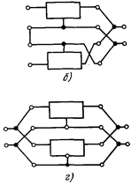 Если во внутренней цепи 2х2 - полюсника можно выделить 4х1 - полюсник, то такой 2х2 - полюсник называют 2х2 - полюсной подсхемой 4х1 - полюсника. Это понятие иллюстрируется на рис. В.З: внешняя цепь N' заштрихована; 4х1 - полюсник обозначен через N. Здесь N реализуют в виде отрезка НВЛ; внем пара полюсов короткозамкнута либо по диагонали, либо по горизонтали, либо один полюс изолирован от внешней цепи (рис. 2.4). Возможны также сочетания этих приемов. Токи, указанные на рисунке, иллюстрируют регулярность включения цепи в целом и нерегулярность включения ее внутренней части N.