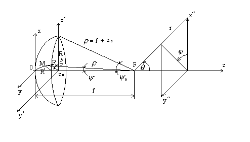 4.Сферическая система координат с началом в фокусе параболоида. Здесь - полярный угол, отсчитываемый от положительного направления оси Z; - азимут, отсчитываемый от плоскости XOZ. Эта система координат удобна для определения координат точки наблюдения и будет использована при расчете поля излучения.