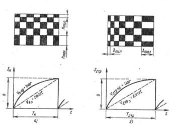(t) = var, т.е. из-за нелинейности токов кадровой или (и) строчной развертки. В этом случае геометрические искажения в вертикальном и горизонтальном направлениях соответственно изображены на (рис. 2.2, а,б)