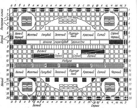 Указанные ТИТ могут быть оптическими (см.рис.2.5) или электронными (см.рис.2.6). Преимуществом оптических таблиц является возможность оценки результирующего качества изображения при проверке всего тракта системы "от света до света", а также оценки величины искажений как в передающем, так и в приемном оборудовании. К сожалению, оптическую таблицу для ЦТ, да еще в многочисленных идентичных экземплярах, создать весьма сложно из-за сравнительно быстрого старения цветных испытательных элементов — изменения их спектральных характеристик. Поэтому в ЦТ для оценки искажений, возникающих в видеоусилительном тракте телецентра, линиях связи и в приемниках, используются лишь электронные ТИТ. Универсальная электронная испытательная таблица (УЭИТ) составляется из эталонных электрических сигналов, формируемых специальным генератором. Искажения в передающем оборудовании оцениваются по монохромным ТИТ и специальными методами.