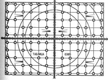 Измерение величин геометрических искажений изображений производится по квадратным или прямоугольным испытательным элементам, входящим в состав специализированных (например, "шахматное поле", см. рис.2,1) или универсальных испытательных таблиц. Визуальную оценку искажений и их коррекцию удобнее проводить по испытательным элементам в виде окружностей, так как искажения формы этих испытательных элементов более заметны: оценка производится дифференциально по сравнительно большой площади таблицы и нарушение любой части окружности в любом участке поля изображения четко отмечается зрительной системой.