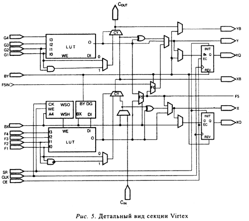 — на базе 4-входовых таблиц преобразования (4-LUT - - Look-UpTable), конфигурируемых либо как 16-битовое ОЗУ (RandomAccessMemory), либо как 16-разрядный сдвиговый регистр;