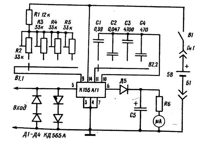Схема №1 – простой аналоговый частотомер, собранный на одновибраторе К155АГ1