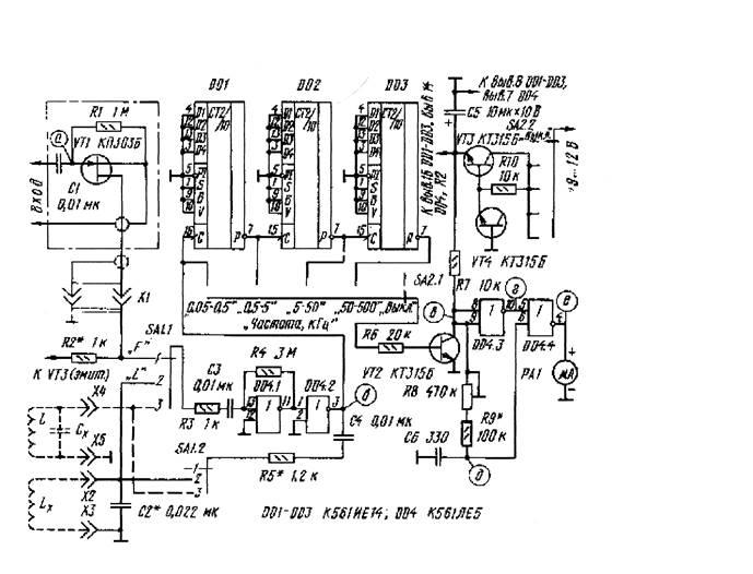 Схема №3 – малоэргономичный комбинированный частотомер, позволяющий измерять ещё и индуктивность различных катушек, резонансную частоту контуров, емкость конденсаторов.