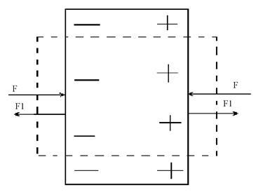Легко видеть, что необходимость существования обратного пьезоэффекта следует из закона сохранения энергии и факта существования прямого эффекта. Рассмотрим пьезоэлектрическую пластинку (рис. 5) и предположим, что мы сжимаем ее внешними силами F. Если бы пьезоэффекта не было, то работа внешних сил равнялась бы потенциальной энергии упруго деформированной пластинки. При наличии пьезоэффекта на пластинке появляются заряды и возникает электрическое поле, которое заключает в себе дополнительную энергию. По закону сохранения энергии отсюда следует, что при сжатии пьезоэлектрической пластинки совершается большая работа, а значит, в ней возникают дополнительные силы F1, противодействующие сжатию. Это и есть силы обратного пьезоэффекта. Из приведенных рассуждений вытекает связь между знаками обоих эффектов. Если в обоих случаях знаки зарядов на гранях одинаковы, то знаки деформаций различны. Если при сжатии пластинки на гранях появляются заряды, указанные на рис. 5, то при создании такой же поляризации внешним полем пластинка будет растягиваться.