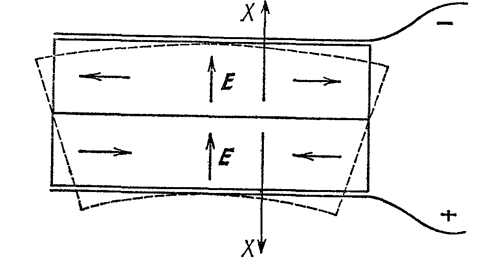 На рис.6 показан двойной пьезоэлемент (составленный из двух пластинок), работающий на сжатие. Пластинки вырезаны из кристалла таким образом, что они одновременно либо сжимаются, либо растягиваются. Если, наоборот, сжимать или растягивать такой пьезоэлемент внешними силами, то между его обкладками появляется напряжение. Соединение пластинок в этом пьезоэлементе соответствует параллельному соединению конденсаторов.