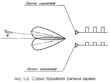 Ферритовые коммутаторы осей переключают волноводный тракт таким образом, что сначала подключают к передатчику все 4 излучателя, формируя одно-лепестковую диаграмму направленности, а затем к двухканальному приемнику, то излучатели, создающие две диаграммы направленности, расположенные в вертикальной плоскости, то излучатели, создающие две диаграммы направленности в горизонтальной плоскости. С выходов приемников сигналы попадают на схему вычитания, где в зависимости от положения цели относительно равносигнального направления, образованного пересечением диаграмм направленности данной пары излучателей, вырабатывается разностный сигнал, амплитуда и полярность которого определяется положением цели в пространстве (рис. 1.3).
