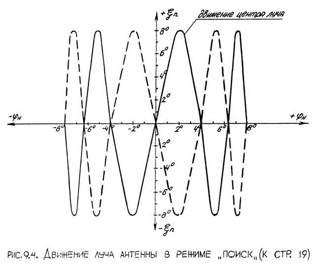 При сближении ракеты с целью до расстояния примерно равного 20-40 км, через СПК на станцию подается разовая команда "поиск". Эта команда поступает в узел (УГА), при этом происходит переключение узла в режим скоростной следящей системы. В этом режиме на вход усилителя переменного тока (УС) узла (УГА) поступает сумма фиксированного сигнала частоты 400 Гц (36В) и напряжение скоростной обратной связи с токогенератора ТГ-5А. При этом вал исполнительного двигателя СД-10А начинает вращаться с фиксированными оборотами, и через кулачковый механизм заставляет качаться зеркало антенны относительно штока (т.е. относительно оси "ξ") с частотой 3 Гц и амплитудой ± 4°. Одновременно двигатель вращает синусный потенциометр - датчик (СПД), выдающий напряжение "заводка" с частотой 0,5 Гц на азимутальный канал системы ПГС. Это напряжение подается на суммирующий усилитель (УС) узла (КС φ) и далее на привод антенны по оси. В результате этого зеркало антенны начинает совершать колебания по азимуту с частотой 0,5 Гц и амплитудой ± 4°.
