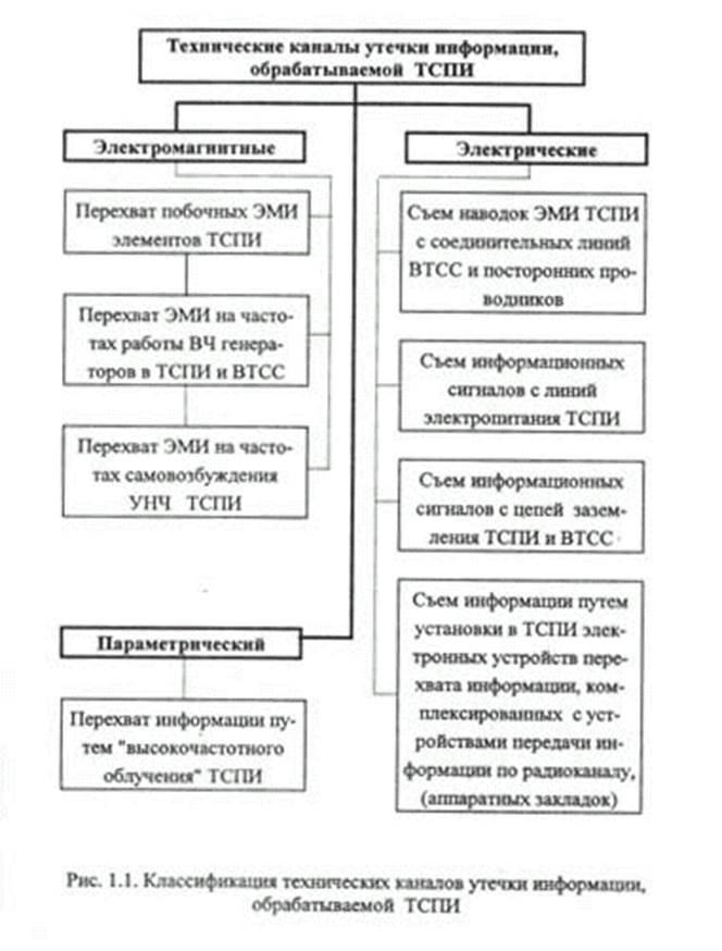 В зависимости от физической природы возникновения информационных сигналов, а также среды их распространения и способов перехвата, технические каналы утечки информации можно разделить на электромагнитные, электрические и параметрический. Схема представлена в приложении 1.1.