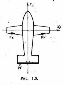 , создаются соответственно с помощью руля высоты РВ и руля поворота РП. Принцип действия каждого из этих рулей аналогичен описанному выше принципу действия руля глубины. При отклонении руля высоты корпус аппарата поворачивается вокруг оси yр