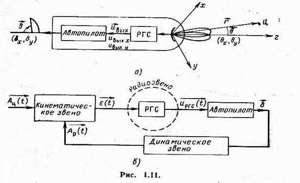 В этой схеме РГС — радиотехническая головка самонаведения (координатор), измеряющая параметр рассогласования ,характеризующий величину и направление отклонения аппарата (ракеты) от правильного полета на цель Ц.