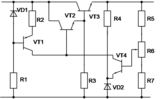 Данная схема состоит из регулирующего элемента, источника опорного напряжения и усилителя обратной связи. Роль регулирующего элемента играет комплиментарный транзистор (состоит из 2х