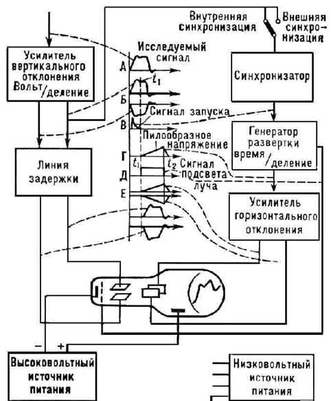 Осциллограф содержит также источники высоковольтного и низковольтного питания. Первый используется только для питания трубки, а второй - для питания электронной схемы остальных узлов и блоков прибора.