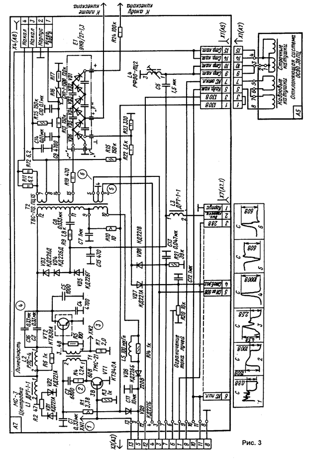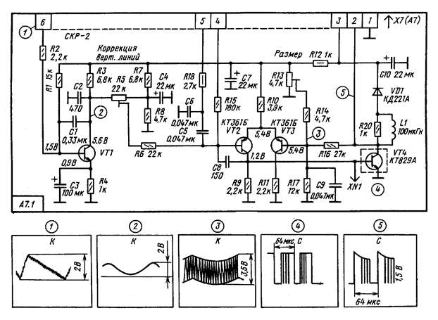 Предварительный и выходной каскады (Рис. 3). На базу транзистора VТ1 от задающего генератора, находящегося в модуле радиоканала, через контакт 13 соединителя Х3 (А3) поступают управляющие прямоугольные импульсы длительностью 20—30 мкс с периодом следования 64 мкс. Нагрузкой транзистора является межкаскадный трансформатор Т1, вторичная понижающая обмотка которого включена в базовую цепь транзистора VТ2. Напряжение на коллектор транзистора VT1 подается с контакта 3 соединителя X1 (А5) через короткозамкнутую перемычку, установленную в соединителе отклоняющей системы между контактами 1 и 3, а также через цепь развязки R1С1 и первичную обмотку трансформатора Т1.