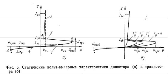 Режим работы динисторов и тринисторов хорошо иллюстрируется их 'статическими вольт-амперными характеристиками, из которых можно получить представление об основных параметрах этих приборов. На рис. 5,а приведена типовая вольт-амперная характеристика динистора. Здесь по горизонтальной оси .отложено напряжение и