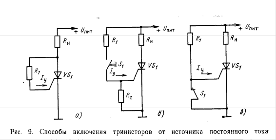 В схеме рис. 9.в тринистор открывается и через нагрузку начинает проходить ток при размыкании выключателя .S1. Такой способ отпирания тринистора менее экономичен, чем два предыдущих, поскольку от источника питания постоянно потребляется ток, равный Uпит/R1; при закрытом приборе он протекает через замкнутые контакты S