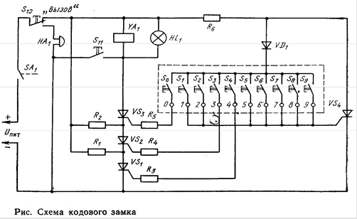 На рис. приведена схема устройства, выполняющего функции дверного кодового замка, которая иллюстрирует многочисленные возможности практического использования выключателей на тринисторах с кнопочным управлением.