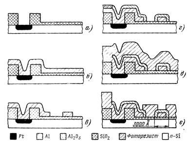 а-- нанесение толстого и тонкого слоев окисла кремния перед металлизацией (показана область омического контакта); б—нанесение алюминия, образующего первый уровень; в — фотогравировка первого уровня металла; г — анодирование первого уровня металлизации с фоторезистивной маской; д —