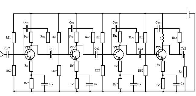 Всеми перечисленными выше свойствами обладают усилители с отрицательными комбинированными обратными связями [1], что достигается благодаря совместному использованию последовательной местной и параллельной обратной связи по напряжению