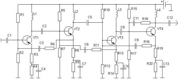Все перечисленные выше достоинства можно реализовать в усилителе с перекрёстными обратными связями [1,2]. Такие усилители не требуют настройки, имеют стабильные параметры и сохраняют неизменной полосу пропускания при наращивании числа каскадов.